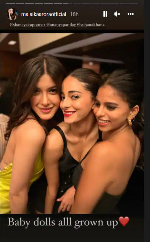 एक्ट्रेस मलाइका अरोड़ा ने अपने इंस्टग्राम स्टोरी पर दो तस्वीरें पोस्ट की हैं। इन तस्वीरों में सुहान खान के साथ अनन्या पांडे और शनाया कपूर नजर आ रही हैं। इस फोटो में तीनों गर्ल्स का पोज देने का अंदाज बेहद ही कातिलाना नजर आ रहा है। इन तस्वीरों को शेयर करते हुए मलाइका ने लिखा, 'बेबी डॉल्स अब बड़ी हो गईं।' इस तस्वीर को इंटरनेट पर काफी पसंद किया जा रहा है।