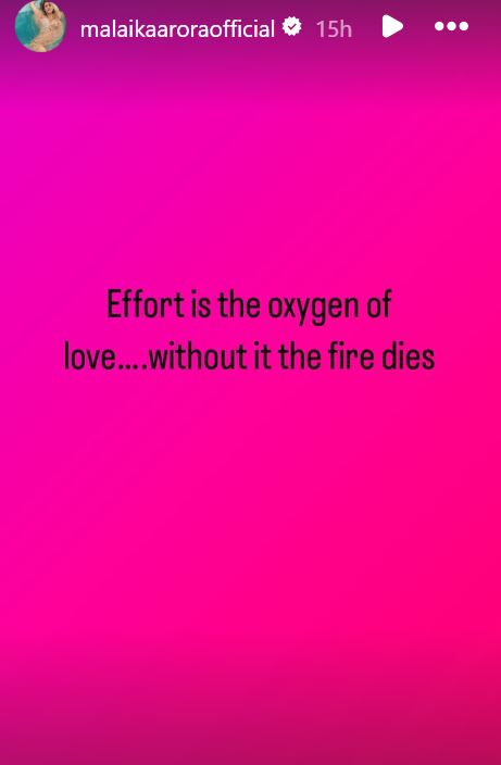 मलाइका अरोड़ा ने इंस्टाग्राम स्टोरी पर एक पोस्ट शेयर किया है। चंद शब्दों की इस लाइन ने प्यार और ब्रेकअप के कारण बताए हैं। एक्ट्रेस ने स्टोरी में लिखा, "कोशिश प्यार का ऑक्सीजन है। बिना इसके, आग मर जाती है।"