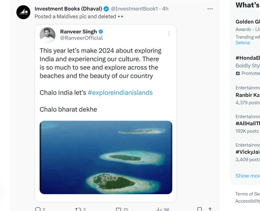 इसके पहले रणवीर ने चलो भारत देखें हैशटैग के साथ फोटो लगाई थी। हालांकि, इसमें गलती उनसे ये हुई थी कि लक्षद्वीप की जगह मालदीव की फोटो लगा दी, जिसके बाद ये पोस्ट आग की तरह फैल गया। बाद में उन्होंने पोस्ट डिलीट किया और दोबारा ट्वीट किया।