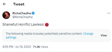 उनके अलावा बॉलीवुड एक्ट्रेस उर्मिला मातोंडकर ने ट्वीट करते हुए लिखा, "मणिपुर में हुए हादसे के वीडियो से मैं अंदर से हिल गई हूं और इस फैक्ट से शॉक में हूं कि यह मई में हुआ और इस पर किसी भी तरह की कोई कार्रवाई नहीं की गई। उन लोगों को शर्म आनी चाहिए जो सत्ता के नशे में चूर हैं और ऊंची पोस्ट पर बैठे हुए हैं। मशहूर हस्तियां चुप हैं, प्यारे भारतीय हम यहां पर कब पहुंचे"।