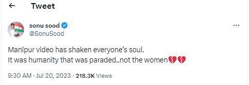 मणिपुर में महिलाओं के साथ हुए अपराध पर सोनू सूद ने अपना गुस्सा व्यक्त करते हुए लिखा, "मणिपुर में हुए हादसे ने हर किसी की आत्मा को अंदर तक हिलाकर रख दिया है। ये इंसानियत की लोगों ने परेड निकाली है, सिर्फ महिला की नहीं"।
