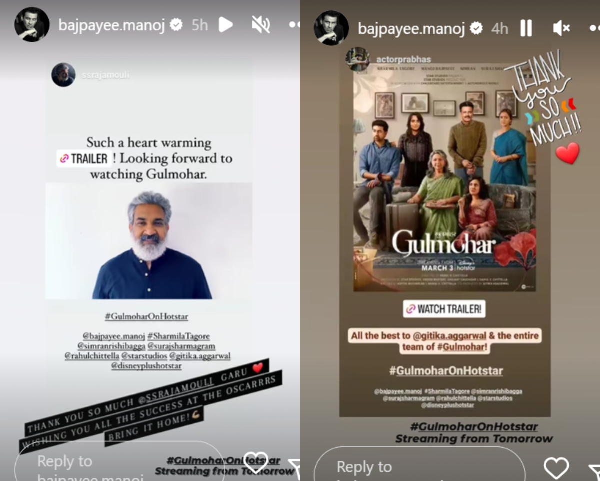 इतनी मसरूफियत के बावजूद राजामौली ने गुलमोहर की टीम के लिए शुभकामना संदेश भेजा है, जिसका वीडियो उन्होंने अपनी इंस्टा स्टोरी में पोस्ट किया है। इस वीडियो में राजामौली कह रहे हैं, मनोज बाजपेयी हमेशा की तरह टॉप फॉर्म में हैं। शर्मिला टैगोर कई साल बाद वापस आयी हैं। इस फिल्म को देखने का बेसब्री से इंतजार है।