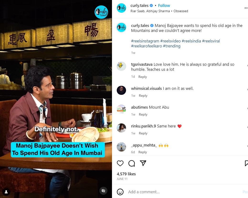 कर्ली टेल्स के इंटरव्यू में मनोज बाजपेयी से पूछा गया कि अगर उन्होंने फिल्म इंडस्ट्री से रियाटरमेंट ले ली, तो वह कहां रहना पसंद करेंगे। इसके जवाब में उन्होंने कहा कि वह मुंबई से दूर पहाड़ों पर रहना पसंद करेंगे।