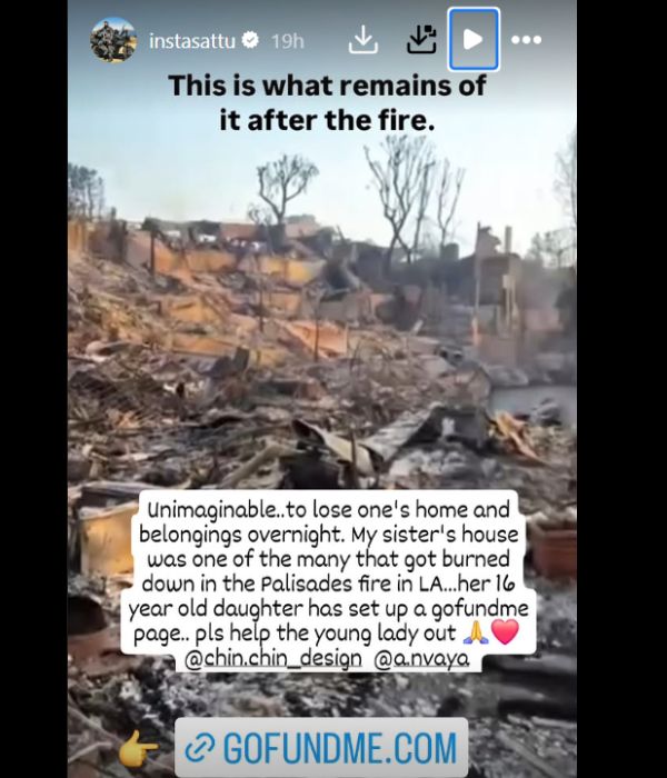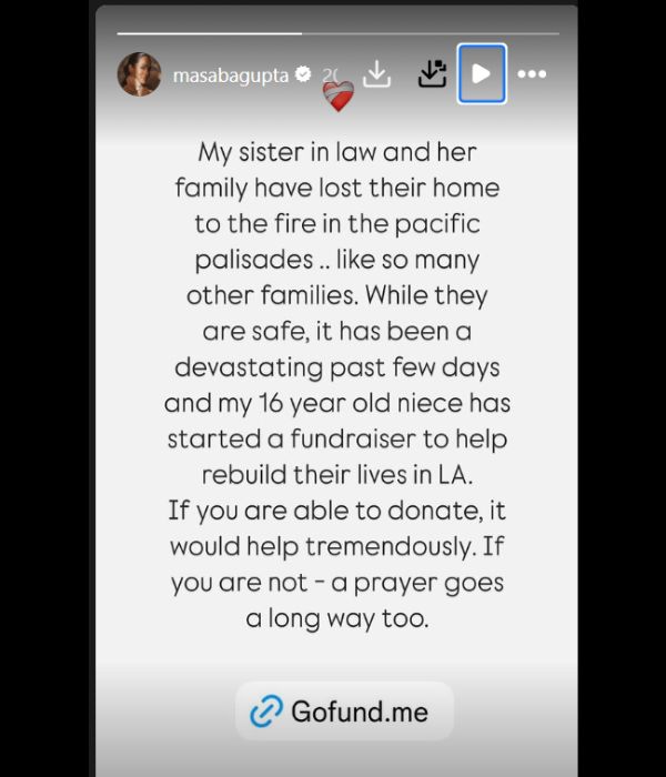 लॉस एंजेलिस के जंगलों में लगी आग से तबाही थमने का नाम नहीं ले रही है। इस आग के कारण कई लोगों की जान चली गई है और बड़ी संख्या में घर जलकर राख हो गए हैं। फैशन डिजाइनर मसाबा गुप्ता (Masaba Gupta) ने एक पोस्ट साझा कर जानकारी दी कि उनकी ननद का घर भी इस आग की चपेट में आकर पूरी तरह से जल गया है।