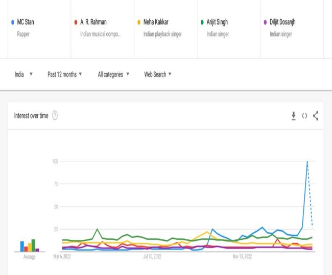गूगल ट्रेंड्स की हालिया रिपोर्ट्स में एमसी स्टैन को हिंदी फिल्म इंडस्ट्री के बड़े से बड़े संगीतकारों से आगे निकलते हुए देखा गया है। उन्होंने जो ये मील का पत्थर हासिल किया है वो बड़े-बड़ों को नसीब नहीं हुआ। कोई भी अन्य सिंगर, संगीतकार या रैपर, बस्ती का हस्ती यानी एमसी स्टैन की पॉपुलैरिटी को छू भी नहीं पाया है।