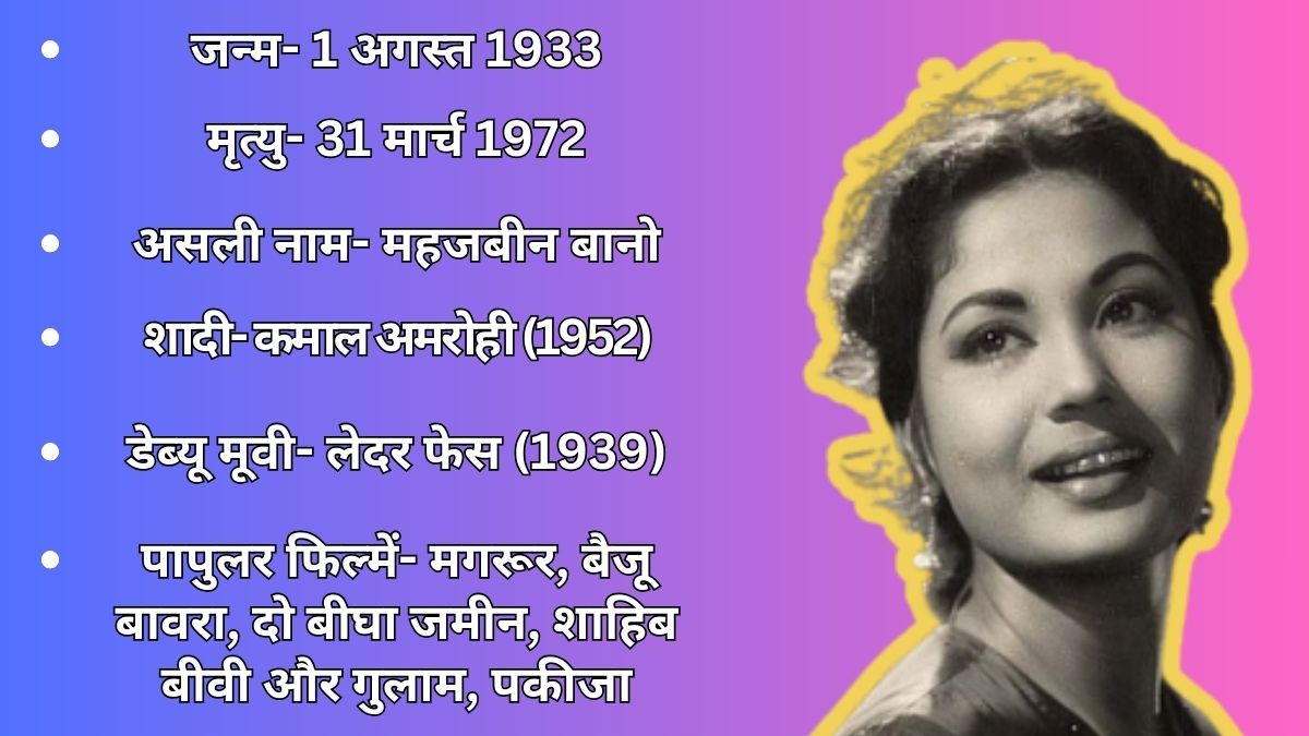 मीना कुमारी (Meena Kumari) सिनेमा जगत की वो खूबसूरत अदाकारा थीं जिन्होंने कई दशकों तक इंडस्ट्री पर राज किया था। 1 अगस्त को मीना कुमारी की बर्थ एनिवर्सरी (Meena Kumari Birth Anniversary) मनाई जाती है। एक्ट्रेस की लाइफ को लेकर आज हम कई अहम पहलूओं पर बात करेंगे जिनके बारे में शायद ही आपको मालूम होगा। आइए मीना कुमारी से जुड़े ये रोचक किस्से जानते हैं।