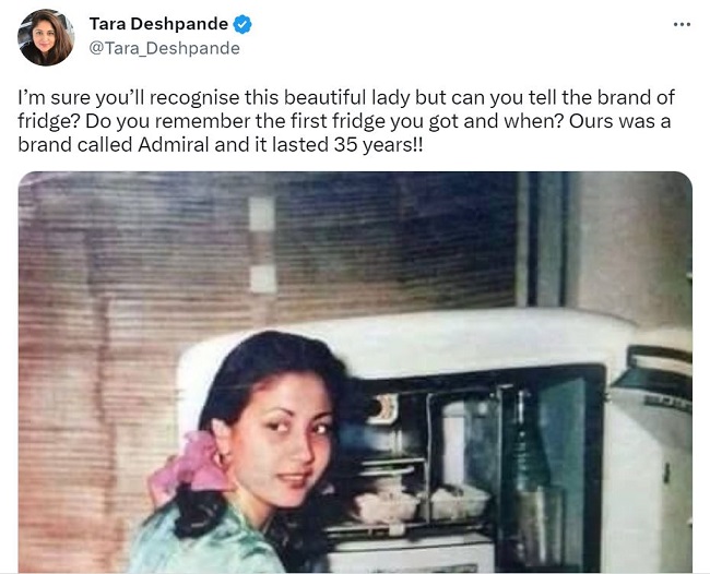 हाल ही में, एक्ट्रेस तारा देशपांडे ने मीना कुमारी की विंटेज फोटो शेयर की है। तारा देशपांडे में तस्वीरें ट्विटर पर शेयर करते हुए लिखा है, 'मुझे पता है, आप लोग इस खूबसूरत महिला को पहचान जाओगे लेकिन क्या आप बता सकते हो कि यह कौन से ब्रांड का फ्रिज है? क्या आपको याद है कि आपने पहला फ्रिज कब खरीदा था। हमारा ब्रांड एडमिरल था और वह 35 वर्षों तक चला था।'