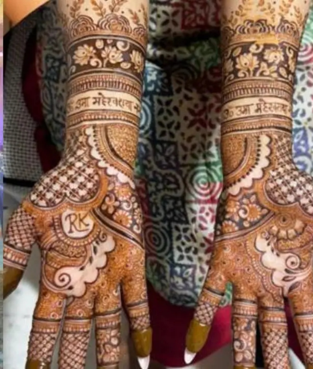 फोटो में देख सकते हैं मीरा ने अपने हाथों पर मेहंदी से होने वाले पति के शुरुआती अक्षर आरके लिखवाया है। इसी के साथ शिव और पार्वती मंत्र भी लिखाया है।