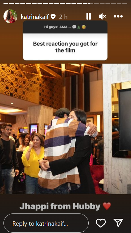 जब इस सेशन के दौरान एक फैन ने उनसे पूछा गया कि उनकी फिल्म 'मैरी क्रिसमस' के लिए उन्हें सबसे अच्छी प्रतिक्रिया क्या मिली। इसका जवाब देते हुए कटरीना ने फिल्म के प्रीमियर पर विक्की कौशल की उन्हें हग करते हुए वाली एक तस्वीर शेयर की और लिखा 'झप्पी फ्रॉम हब्बी'।