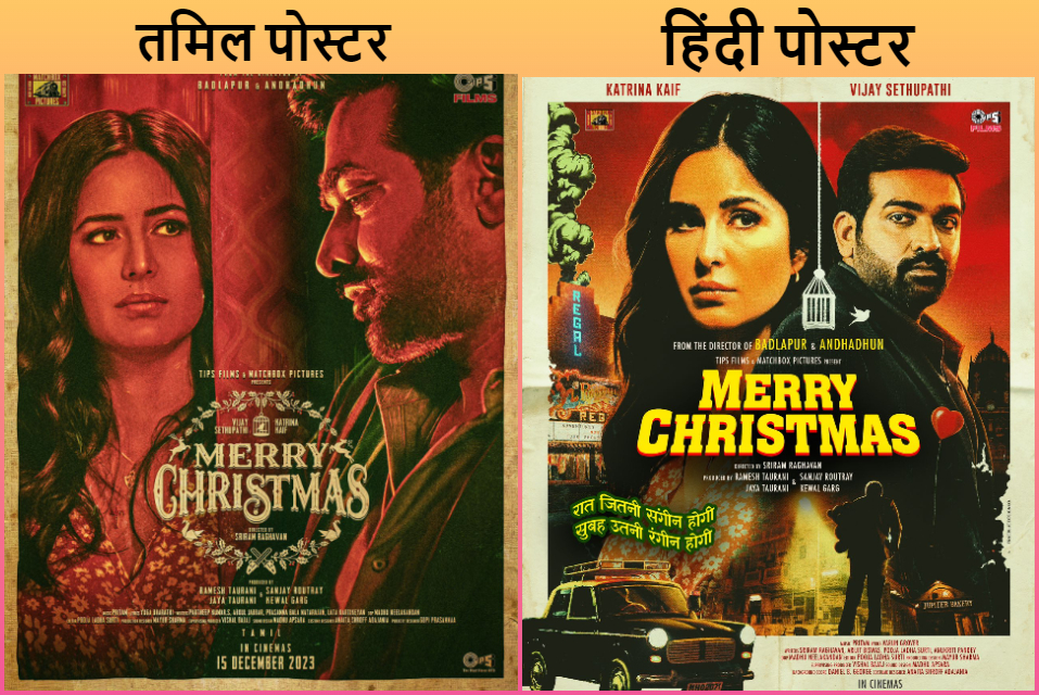 Merry Christmas Posters in Tamil and Hindi श्रीराम राघवन निर्देशित फिल्म का सबसे बड़ा आकर्षण कटरीना कैफ और विजय सेतुपति की कास्टिंग है। बॉलीवुड और साउथ का यह कॉम्बिनेशन एक दिलचस्प कहानी की तरफ इशारा कर रहा है। यही वजह है कि लोग मेरी क्रिसमस का बेसब्री से इंतजार कर रहे हैं। यह फिल्म 2023 में क्रिसमस पर रिलीज होगी।
