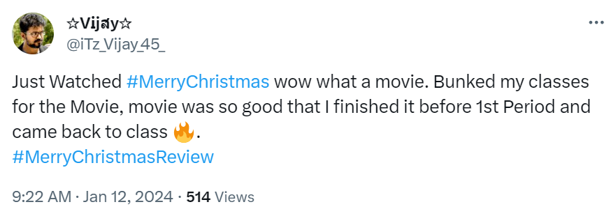 सोशल मीडिया हैंडल एक्स पर फिल्म की तारीफ करते हुए एक यूजर ने लिखा 'अभी-अभी 'मैरी क्रिसमस' देखी, वाह क्या फिल्म है। मूवी के लिए क्लास बंक कर दी, मूवी इतनी अच्छी थी कि मैंने इसे पहले पीरियड से पहले ही खत्म कर लिया और क्लास में वापस आ गया'।