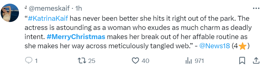 दूसरे यूजर ने एक्ट्रेस की तारीफ करते हुए लिखा 'कटरीना कैफ इससे बेहतर कभी नहीं रही, वह इसे पार्क के ठीक बाहर हिट करती हैं। अभिनेत्री एक ऐसी महिला के रूप में आश्चर्यजनक है जो घातक इरादे के साथ-साथ आकर्षण भी प्रदर्शित करती है। 'मैरी क्रिसमस' उन्हें उनकी मिलनसार दिनचर्या से बाहर निकालती है, क्योंकि वह सावधानीपूर्वक उलझे हुए जाल में अपना रास्ता बनाती है'।