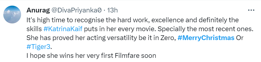 तीसरे यूजर ने लिखा 'अब समय आ गया है कि कटरीना कैफ द्वारा अपनी हर फिल्म में की गई कड़ी मेहनत, उत्कृष्टता और निश्चित रूप से कौशल को पहचाना जाए। विशेषकर सबसे नवीनतम वाले। उन्होंने 'जीरो', 'मैरी क्रिसमस' या 'टाइगर 3' में अपनी अभिनय बहुमुखी प्रतिभा साबित की है। मुझे उम्मीद है कि वह जल्द ही अपना पहला फिल्मफेयर जीतेंगी'।