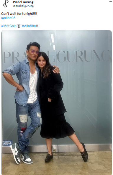 मेट गाला इवेंट से पहले इंटरनेशनल फैशन डिजाइनर प्रबल गुरुंग ने अपने ऑफिशियल ट्विटर हैंडल पर एक लेटेस्ट तस्वीर शेयर किया हैं। इस फोटो में प्रबल के साथ बॉलीवुड एक्ट्रेस आलिया भट्ट नजर आ रही हैं। इस दौरान आलिया ब्लैक ड्रेस में बेहद खूबसूरत दिख रही हैं। वहीं, आलिया, प्रबल के साथ पोज देती नजर आ रही हैं। इस फोटो के कैप्शन में प्रबल ने लिखा है कि ‘आज रात का बिल्कुल भी इंतजार नहीं कर सकते।‘ इस तस्वीर को सोशल मीडिया पर काफी पसंद किया जा रहा है।