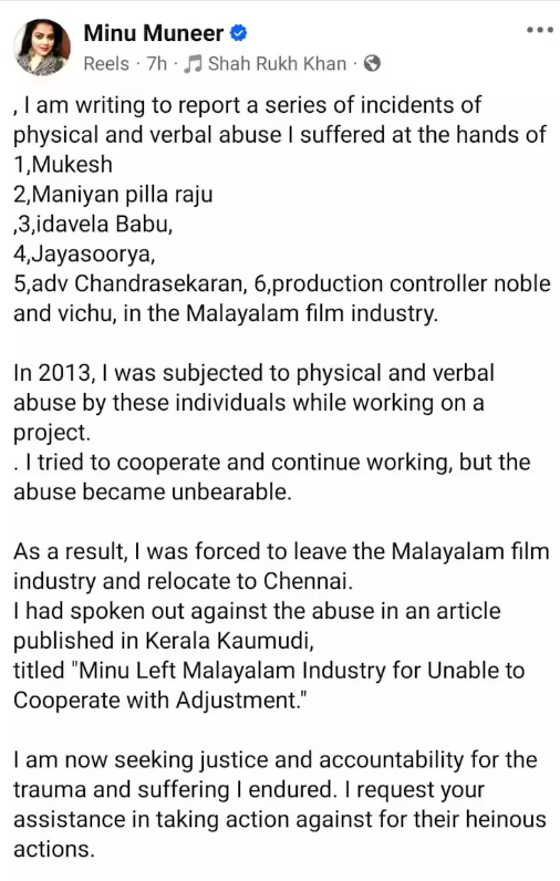मीनू मुनीर ने अपने फेसबुक अकाउंट पर एक लंबा-चौड़ा पोस्ट शेयर करते हुए दावा किया, "मैं उन सभी घटनाओं के बारे में लिख रही हूं, जब मुझे मलयालम फिल्म इंडस्ट्री में शारीरिक और मौखिक रूप से मुकेश, मानियन पिल्ला राजू, इदावेला बाबू, जयसूर्या, एडवोकेट चंद्रशेखरन, प्रोडक्शन कंट्रोलर नोबल और विचू के हाथों प्रताड़ित किया गया।