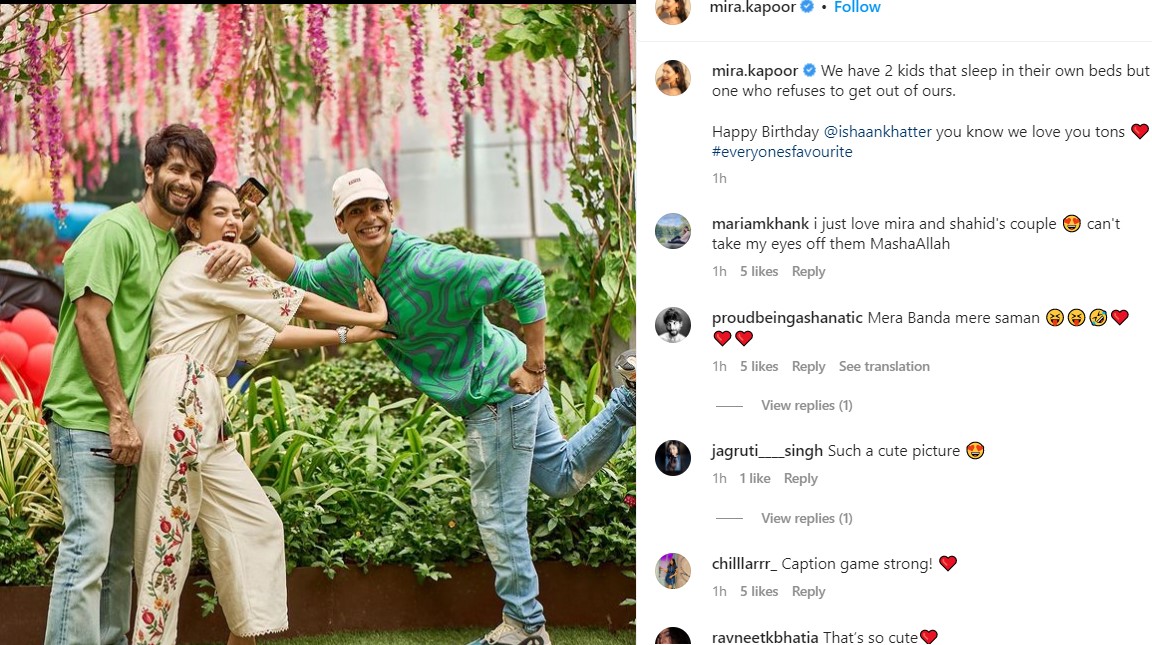 मीरा राजपूत ने ईशान के साथ अपनी और शाहिद की फोटो शेयर की है। इसे मजेदार कैप्शन देते हुए उन्होंने ईशान की एक पोल भी खोल दी है। मीरा ने लिखा, 'हमारे दो बच्चे हैं जो अपने-अपने बिस्तर पर सोते हैं, लेकिन एक ऐसा भी है, जो हमारे बिस्तर से उठने से ही मना कर देता है।' इस तस्वीर में मीरा, ईशान को धक्का देती हुए दिखाई दे रही हैं। इस पोस्ट पर फैंस ने भी खूब मजे लिए हैं।