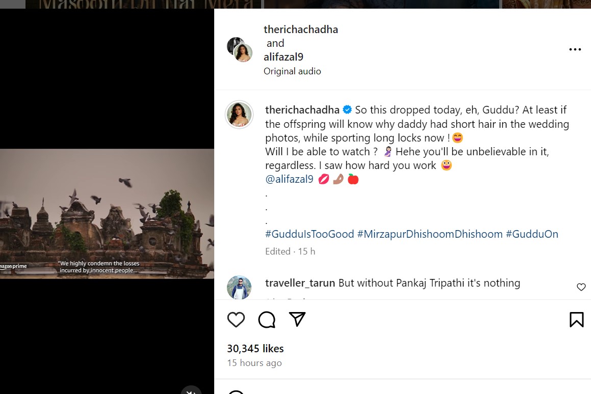 ऋचा चड्ढा ने अपने सोशल मीडिया हैंडल इंस्टाग्राम पर मिर्जापुर 3 का ट्रेलर शेयर किया है। इसके शेयर करते हुए एक्ट्रेस ने लिखा कि तो आज ये आ गया, है न गुड्डू। कम से कम अगर बच्चे को पता चले कि शादी की तस्वीरों में डैडी के बाल छोटे क्यों थे, जबकि अब वो लंबे बाल रखते हैं।