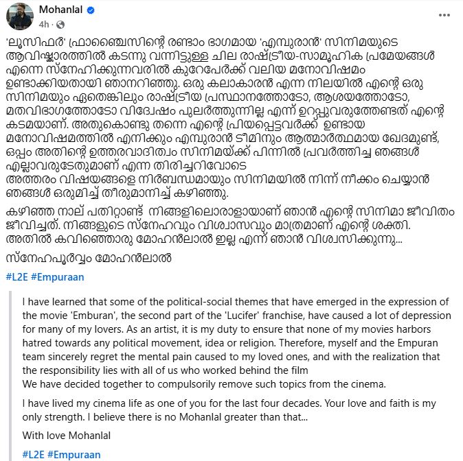मोहनलाल ने पोस्ट में आगे कहा, "मुझे यह एहसास है कि जिम्मेदारी हम सभी की है जिन्होंने फिल्म के लिए काम किया है, हमने मिलकर फिल्म से ऐसे हिस्सों को अनिवार्य रूप से हटाने का फैसला किया है। मैंने पिछले चार दशकों से आप लोगों में से एक बनकर अपना सिनेमाई जीवन जिया है। आपका प्यार और विश्वास ही मेरी एकमात्र ताकत है। मेरा मानना है कि मोहनलाल इससे बढ़कर कुछ नहीं है।"