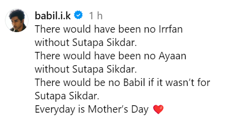 इस फोटो को शेयर करते हुए उन्होंने लिखा कि सुतापा सिकदर के बिना कोई इरफ़ान नहीं होता। सुतापा सिकदर के बिना कोई अयान नहीं होता। अगर सुतापा सिकदर नहीं होती, तो कोई बाबिल नहीं होता। हर दिन मदर्स डे है।