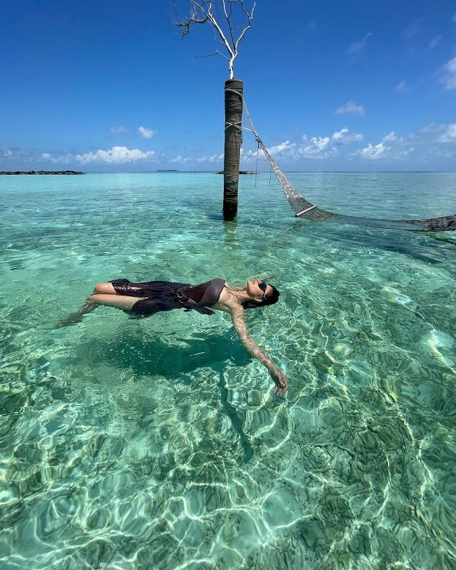 खास बात ये है कि मौनी रॉय इसमें रिलैक्स करती हुईं नजर आ रही हैl पहली तस्वीर में वह समुद्र में उल्टे फ्लोट कर रही हैl दूसरी तस्वीर क्लोजअप हैl तीसरी फोटो में वह एक झूले पर बैठकर पोज दे रही हैं जो कि समुद्र में हैl चौथी फोटो वाइड हैl पांचवीं फोटो में वह अलग अंदाज में पोज दे रहीं हैl