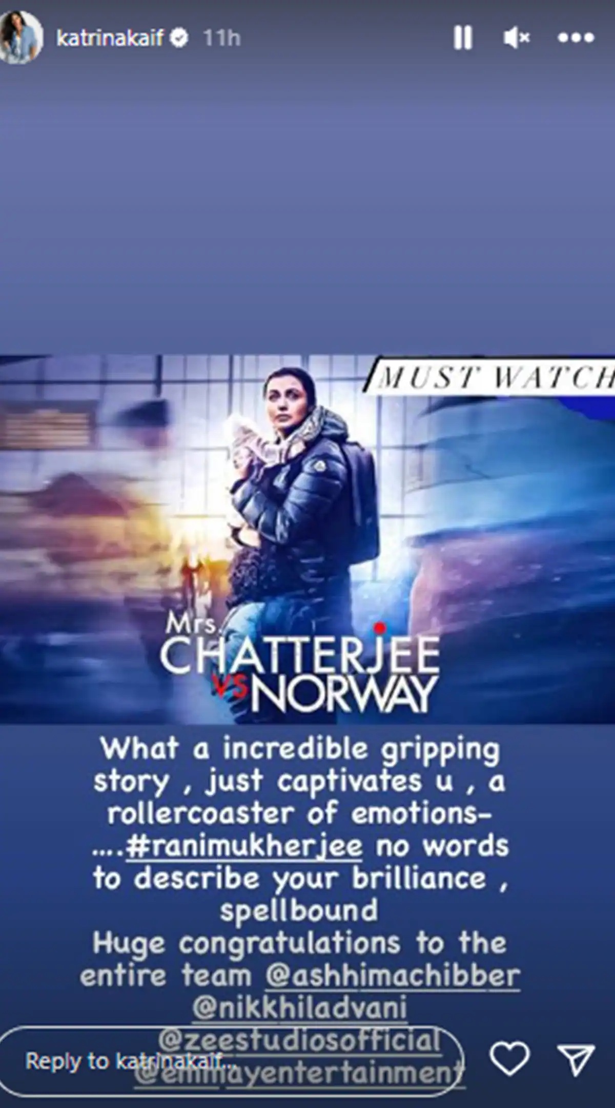 इसके अलावा कटरीना कैफ और विक्की कौशल ने भी मिसेज चटर्जी वर्सेज नॉर्वे देखी और रानी की जमकर तारीफ की। इंस्टाग्राम स्टोरीज पर शेयर किए गए एक पोस्ट में, कटरीना कैफ ने नोट के साथ फिल्म का एक पोस्टर अपलोड किया और लिखा, 'ये एक अविश्वसनीय मनोरंजक कहानी है, बस आपको लुभाती है, भावनाओं का एक रोलर कोस्टर - रानी मुखर्जी, आपकी प्रतिभा का वर्णन करने के लिए शब्द नहीं हैं, मंत्रमुग्ध। पूरी टीम को बहुत-बहुत बधाई।' उन्होंने कैप्शन भी जोड़ा, 'अवश्य देखें।'
