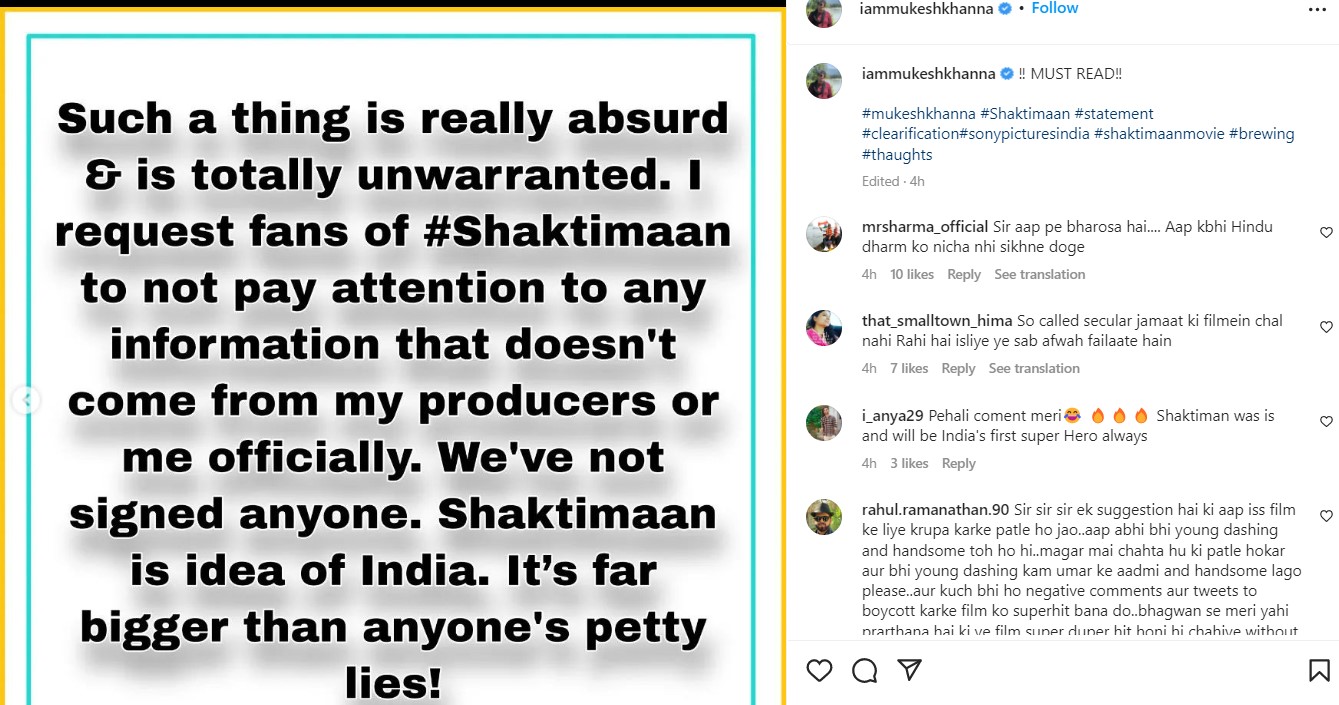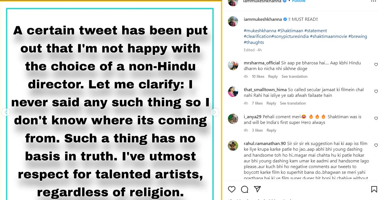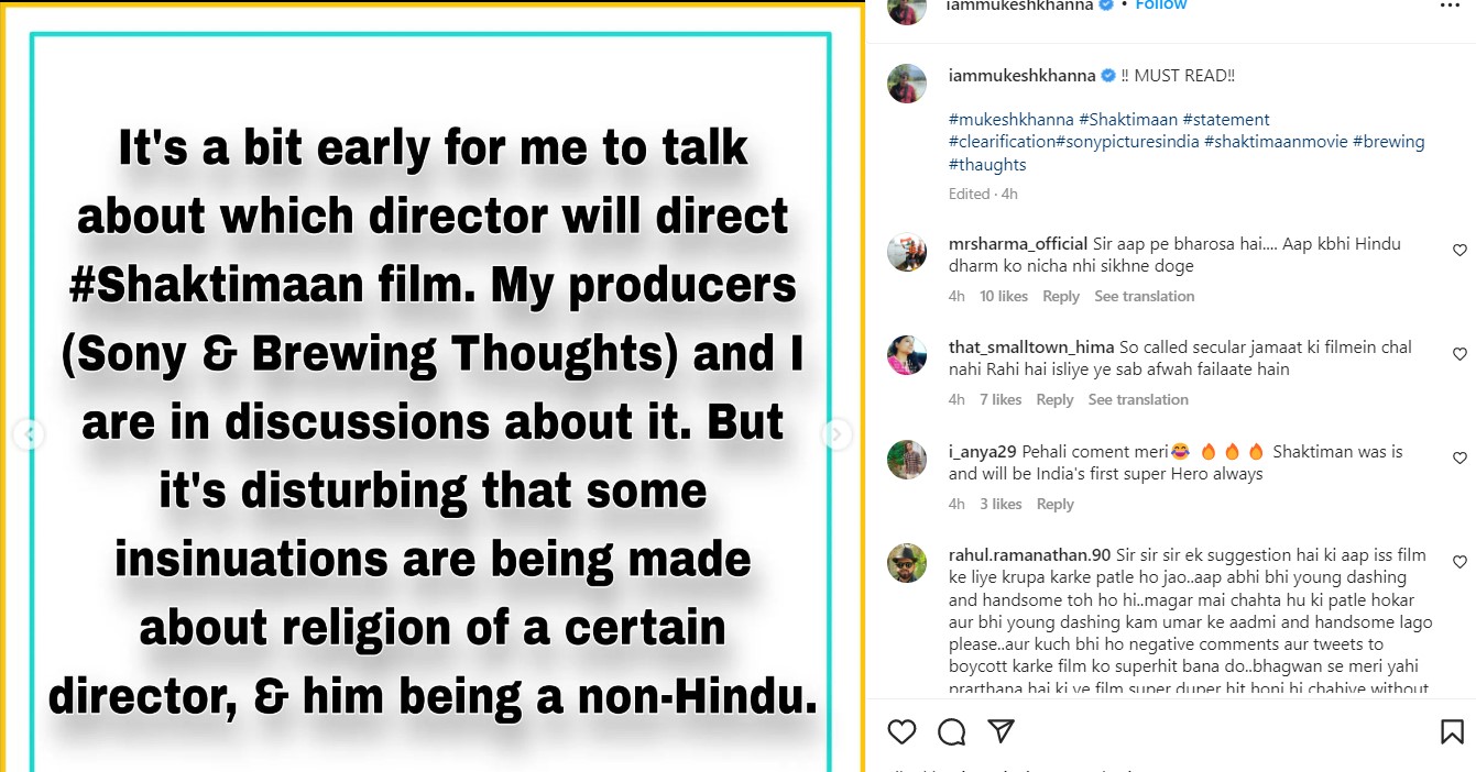 इंस्टाग्राम पर पोस्ट शेयर करते हुए मुकेश खन्ना ने कहा, ‘मेरे लिए यह बात करना थोड़ा जल्दी है कि कौन सा डायरेक्टर फिल्म शक्तिमान को डायरेक्ट करेगा। मैं और मेरे प्रोड्यूसर इस पर अभी बात कर रहे हैं, लेकिन यह बात परेशान करने वाला है कि एक डायरेक्टर के धर्म और उसके गैर हिंदू होने को लेकर कुछ बातें फैलाई जा रही हैं।’