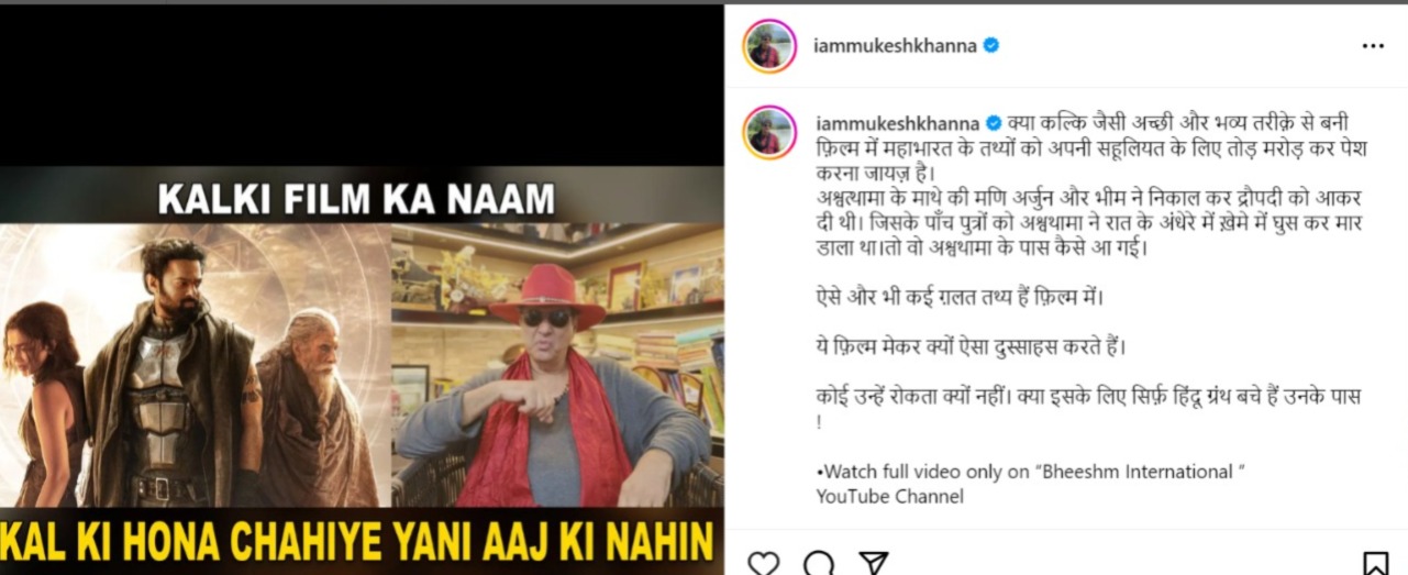 फिल्म कल्कि 2898 एडी (Kalki 2898 AD) की चर्चा बड़ी तेजी से चल रही है। फिल्म की ताबड़तोड़ कमाई ने हर किसी को सरप्राइज किया है। लेकिन इस बीच टीवी सीरियल महाभारत (Mahabharat) में भीष्म पितामह का किरदार निभाने वाले अभिनेता मुकेश खन्ना ने कल्कि की कहानी पर सवाल उठाए हैं और मूवी में अमिताभ बच्चन के अश्वत्थामा वाले किरदार पर अपनी प्रतिक्रिया व्यक्त की है।