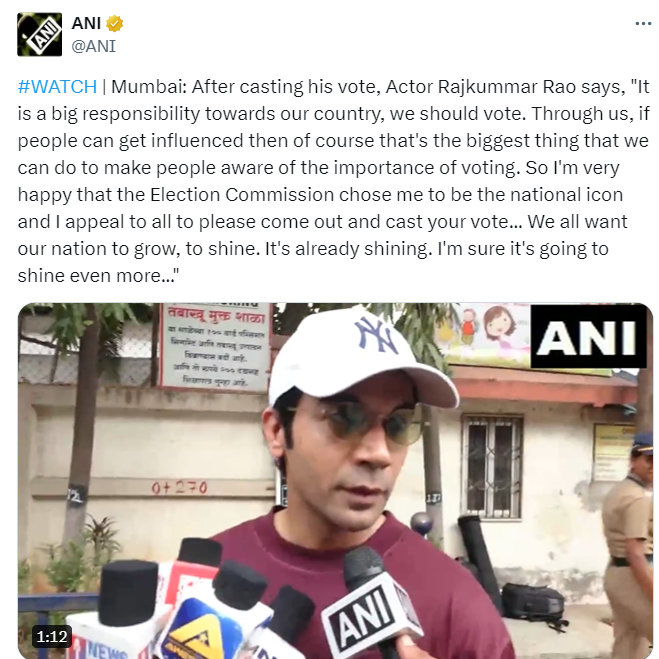 "ये हम सबके लिए बहुत बड़ी जिम्मेदारी है, इसलिए मैं सब छोड़कर फ्लाइट पकड़कर वापस आया हूं। मुझे लगता है कि हम सबके लिए वोट करना बहुत ही इम्पोर्टेंट है, क्योंकि अगर लोग एक पब्लिक फिगर के तौर पर हमसे इन्फ्लुएंस होते हैं, तो हम ये बता सकते हैं कि वोटिंग कितनी मायने रखती है। मुझे खुशी है कि इलेक्शन कमिशन ने मुझे नेशनल आइकन के तौर पर चुना है, मैं बस यही कहूंगा कि सामने आए और वोट करें। मैं बस यही बदलाव चाहता हूं कि देश और तरक्की करें और आगे बढ़े"।