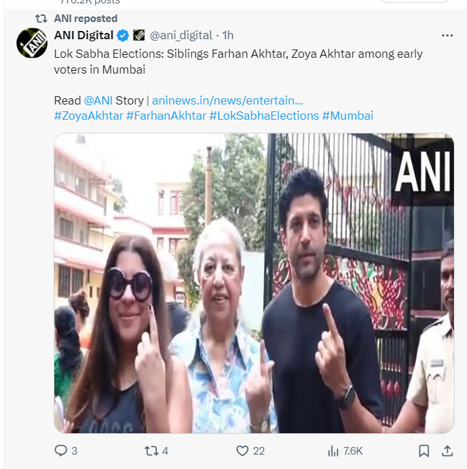 इस बार ज्यादा से ज्यादा लोगों को वोट डालने चाहिए। मैं जब सुबह 7 बजे आया पोलिंग बूथ खुला हुआ था और 500 से 600 लोग लाइन में खड़े थे"। अक्षय कुमार के अलावा फरहान अख्तर और 'जिंदगी न मिलेगी दोबारा' डायरेक्टर जोया अख्तर भी परिवार संग वोटिंग देने के लिए सुबह-सुबह मुंबई के पोलिंग बूथ पर लाइन में लगे।