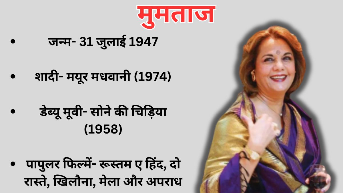 इंडस्ट्री की लीजेंड अभिनेत्रियों में मुमताज (Mumtaz) का नाम भी शामिल रहता है। 60 के दशक में युवा दिलों की धड़कनों के तौर पर मुमताज को पहचाना जाता था। 31 जुलाई को उनका जन्मदिन (Mumtaz Bhirthday) मनाया जाएगा। ऐसे में हम आपको मुमताज से जुड़े अनुसुने किस्सों के बारे में बताने जा रहे हैं जो दारा सिंह और राजेश खन्ना (Rajesh Khanna) से भी ताल्लुक रखते हैं।