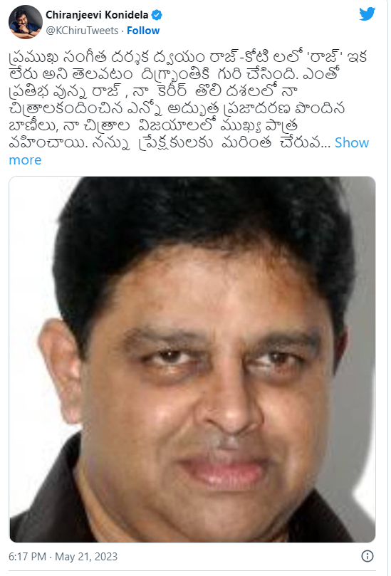 राज के अचानक निधन से तेलुगू इंडस्ट्री को गहरा सदमा लगा है। साउथ के सुपरस्टार चिरंजीवी (Chiranjeevi) ने राज की मौत पर दुख जताया है और उनके नाम एक इमोशनल नोट भी लिखा है। उन्होंने कहा,