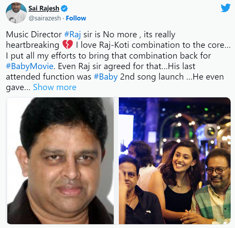 “म्यूजिक डायरेक्टर राज सर अब इस दुनिया में नहीं रहे। ये वाकई दिल टूटने वाला है। मुझे राज-कोटि का कॉम्बिनेशन बहुत पसंद था। मैंने बेबी मूवी के लिए उनका कॉम्बिनेशन लाने की पूरी कोशिश की। यहां तक कि राज सर भी इसके लिए सहमत हो गए थे। आखिरी बार वह बेबी के दूसरे सॉन्ग लॉन्च इवेंट में शामिल हुए थे।”