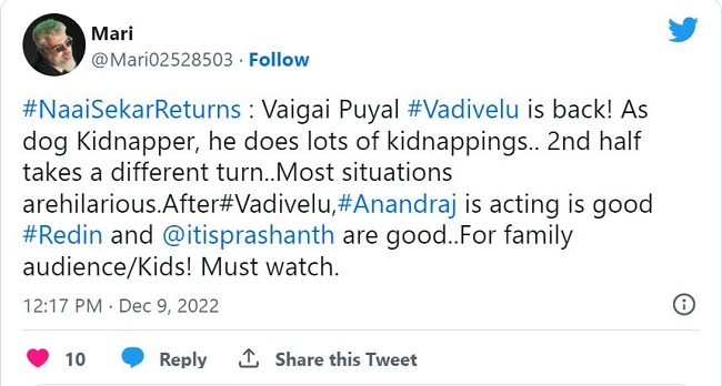 Naai Sekar Returns Twitter Review फिल्म नाई सेकर रिटर्न शुक्रवार 9 दिसंबर को रिलीज हुईं है। इस फिल्म को लेकर फिल्म अभिनेता वादीवेलु काफी उत्साहित है। इस फिल्म में उनके अलावा वह कई कलाकारों की अहम भूमिका है।