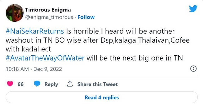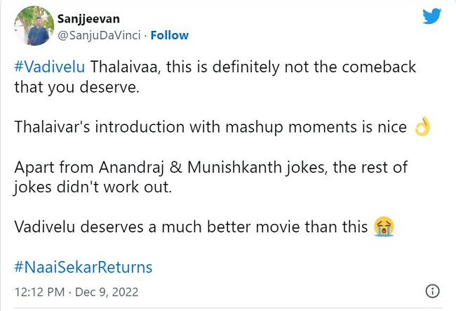 इस बीच वादीवेलु के कमबैक को लेकर भी जितनी हाइप क्रिएट की गई थी, वह उतनी दर्शकों को पसंद नहीं आ रही है। इस फिल्म का निर्देशन सूरज ने किया था। वादीवेलु फिल्म में कुत्ते को किडनैप करने वाले व्यक्ति की भूमिका निभा रहे हैं। फिल्म में शिवांगी सपोर्टिंग रोल में है। संतोष नारायणन ने फिल्म का म्यूजिक दिया है। फिल्म के कई गाने रिलीज हुए हैं। इस बीच तमिलनाडु में साइक्लोन अलर्ट जारी कर दिया गया है। इसके चलते नई रिलीज हुई फिल्मों की कमाई पर भी प्रभाव पड़ सकता है। वहीं इस फिल्म का मुकाबला अवतार: द वाटर वे के साथ है। हॉलीवुड की फिल्म को काफी अच्छे रिव्यु भी मिले हैं।