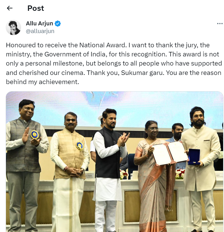 National Film Award मिलने पर इमोशनल हुए Allu Arjun, पुष्पा डायरेक्टर के लिए लिखा खास मैसेज