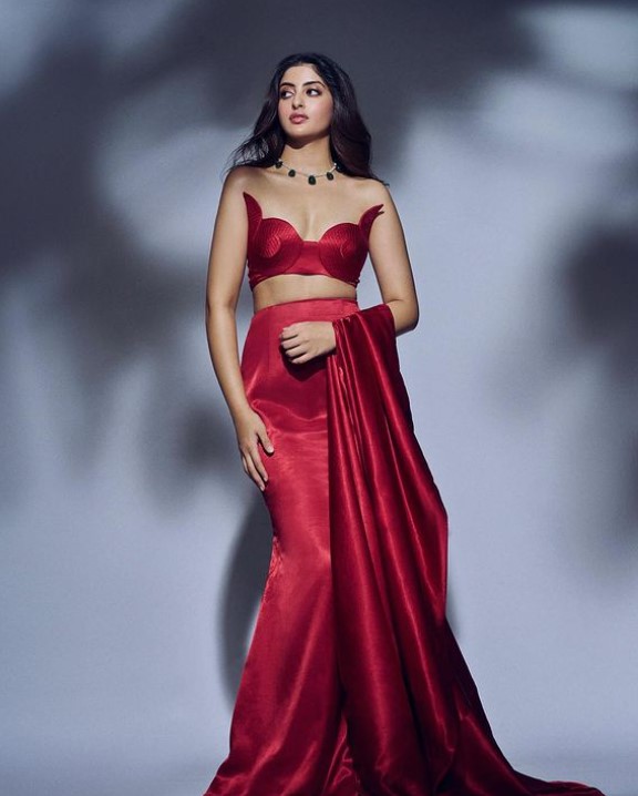 नव्या ने ट्यूब टॉप और टाइट फिश कट स्कर्ट की पेयरिंग पहनी थी। अपने लुक को और ग्लैमरस बनाने के लिए उन्होंने दुपट्टे को पहनने की बजाय हाथ में फोल्ड कर कैरी किया।