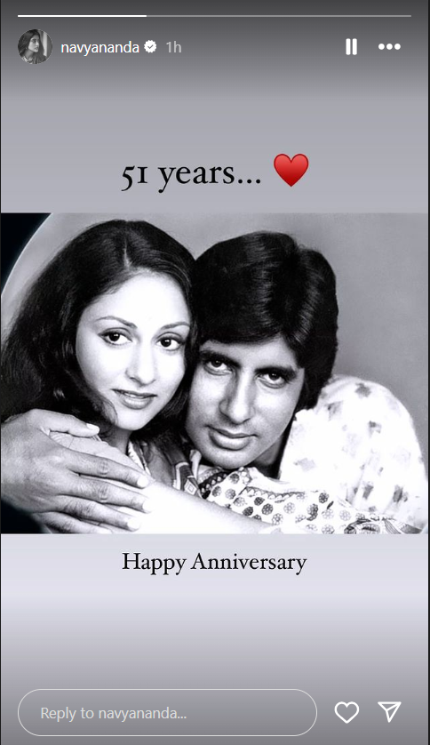 सुबह से ही सोशल मीडिया पर इस कपल को विश करने की बाढ़ आ गई हैं। ऐसे में अब नाती नव्या नवेली नंदा ने भी अपने नाना-नानी पर प्यार बरसाया है। उन्होंने इंस्टाग्राम स्टोरी पर इस पावर कपल की एक पुरानी तस्वीर साझा की है।