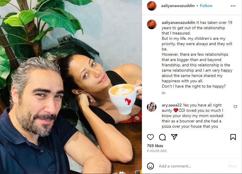 उन्होंने फोटो को कैप्शन देते हुए लिखा, "मैंने जिस रिश्ते को प्यार से सींचा था, उससे बाहर निकलने में मुझे 19 साल से ज्यादा का समय लग गया। लेकिन मेरी जिंदगी में मेरे बच्चे मेरी प्रियोरिटी हैं, वह थे और हमेशा रहेंगे। हालांकि, कुछ रिश्ते होते हैं, जो दोस्ती से ज्यादा बड़े होते हैं, और ये रिश्ता कुछ वैसा ही है। मैं आप सबके साथ अपनी खुशी बांटकर और भी ज्यादा खुश हूं। क्या मुझे खुश रहने का अधिकार नहीं है?