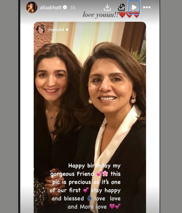 बॉलीवुड की दिग्गज एक्ट्रेस नीतू कपूर ने आलिया को बर्थडे विश करते हुए लिखा, 'हैप्पी बर्थडे मेरी खूबसूरत दोस्त। यह तस्वीर मेरे लिए बेहद खास है, क्योंकि यह हमारी पहली मुलाकात में से एक है। आप हमेशा खुश रहो और ऐसे ही सभी का आशीर्वाद पाती रहो। ढेर सारा प्यार।' बता दें कि आलिया ने भी अपनी सास की पोस्ट को इंस्टा स्टोरी पर शेयर करते हुए, 'लव यू लिखा है।'