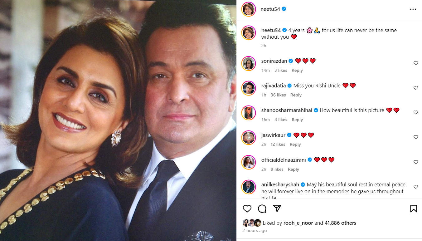 एक्ट्रेस नीतू कपूर ने अपने इंस्टाग्राम अकाउंट पर दिवंगत पति ऋषि संग अपनी फोटो शेयर की हैं और थोड़ा इमोशनल पोस्ट भी लिखा है, जिसे पढ़कर हर किसी की आंखें नम हो रही हैं। अभिनेत्री ने लिखा- 4 साल हो गए, लेकिन आपके बिना यह जिंदगी वैसी नहीं है, जैसी आपके साथ थी।