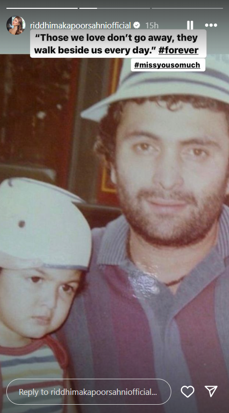 नीतू कपूर के अलावा उनकी बेटी रिद्धिमा कपूर साहनी ने भी पिता को याद करते हुए पोस्ट शेयर किया है। रिद्धिमा ने अपने बचपन की एक तस्वीर पोस्ट की है, जिसमें वह पिता ऋषि कपूर के साथ नजर आ रही हैं। उन्होंने कैप्शन में लिखा, ‘जिनसे हम प्यार करते हैं, वे हमसे कभी दूर नहीं जाते हैं. वे हर दिन हमारे साथ होते हैं। मैं आपको हमेशा बहुत मिस करती हूं। इसके दामाद भरत साहनी के इंस्टा स्टोरी को शेयर किया है।
