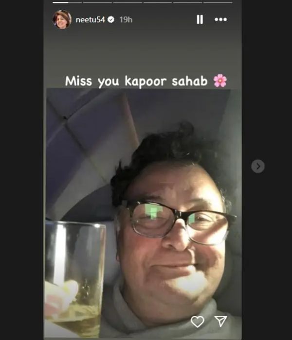 एक्ट्रेस नीतू कपूर ने इंस्टाग्राम स्टोरी पर एक पुरानी तस्वीर ऋषि कपूर की शेयर की। दरअसल, यह एक सेल्फी है, जिसमें उनके हाथ में जाम और चेहरे पर मुस्कान देखने को मिल रही है। इस तस्वीर के साथ एक्ट्रेस ने लिखा, 'मिस यू कपूर साहब।'