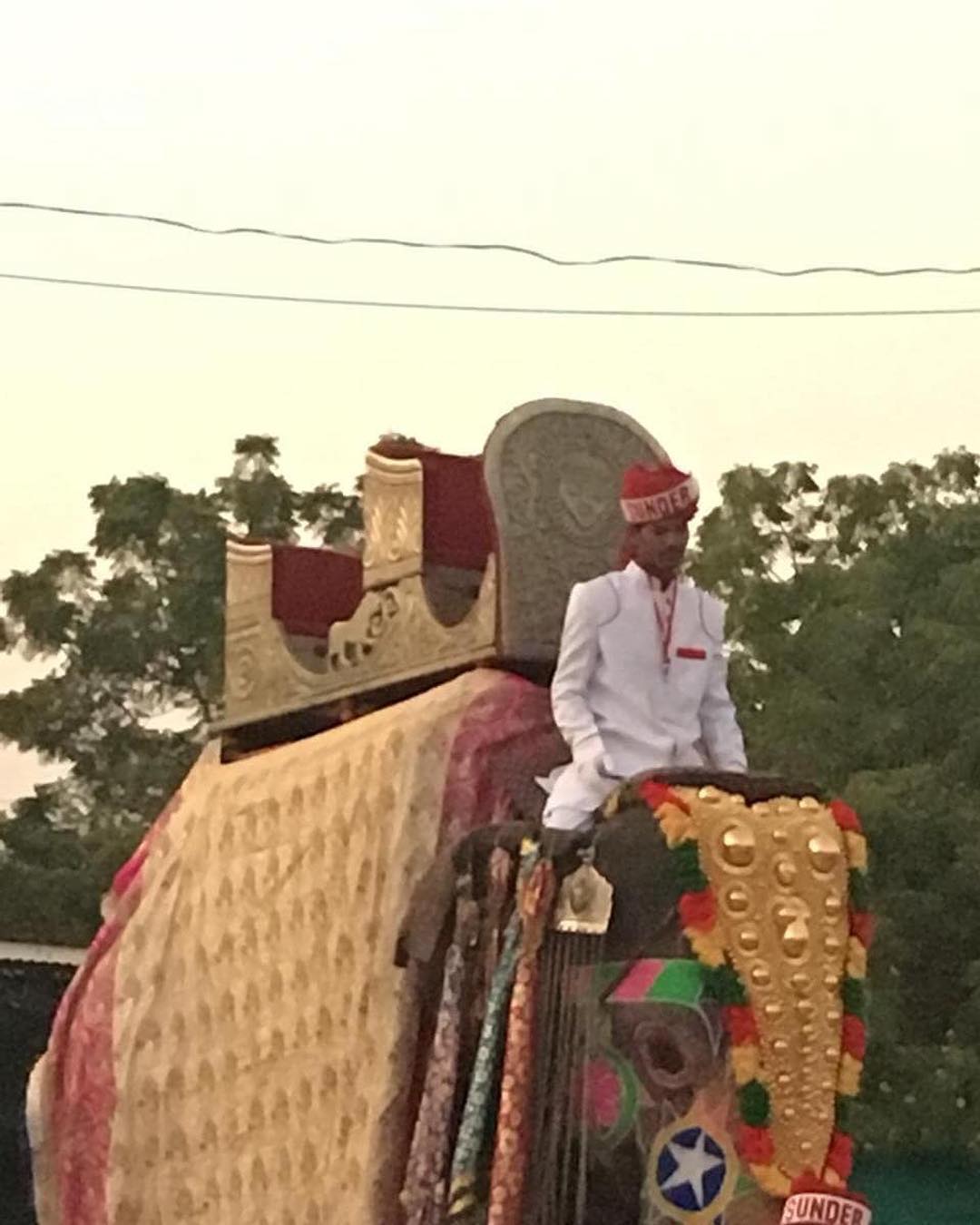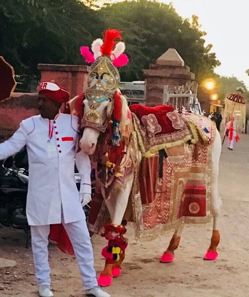 घुड़चढ़ी के लिए घोड़ी को तैयार करने की तस्वीरें रविवार को सोशल मीडिया में सर्कुलेट हो रही थीं। नीचे वाली तस्वीर में सजी हुई घोड़ी और इसके हैंडलर को देखा जा सकता है। इसी तस्वीर में अगर ग़ौर करें तो एक कर्मचारी छत्र ले जाता हुआ दिखाई दे रहा है। यह छत्र घोड़ी पर सवार दूल्हे के पीछे लगा रहता है।