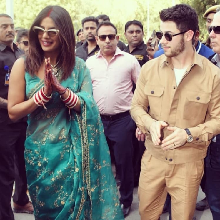 साड़ी पहने, कलाइयों में चूड़ा डाले और मांग में सिंदूर सजाए प्रियंका नई नवेली दुल्हन के अंदाज़ में दिखीं। साथ में दूल्हा निक जोनस अपने चित-परिचित अवतार में दिखे। कपल ने वहां मौजूद मीडिया के लिए पोज़ भी दिये।