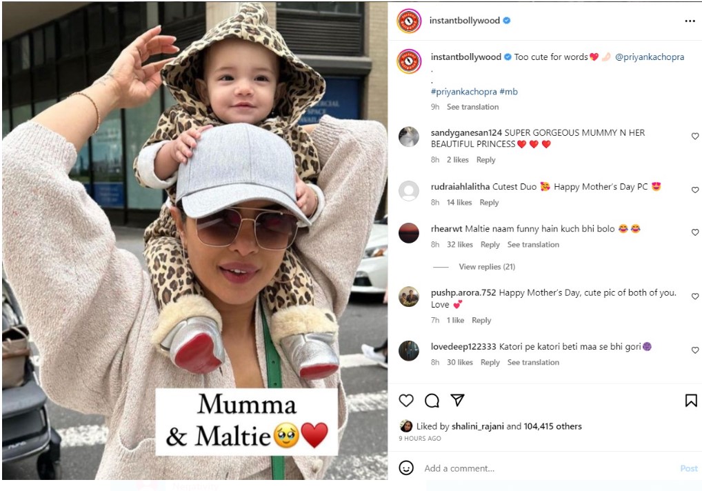 गौरतलब है कि प्रियंका चोपड़ा सरोगेसी के जरिये 15 जनवरी, 2022 को मालती मैरी की मां बनीं। प्रियंका ने हाल ही में एक इंटरव्यू में बताया था कि जब वह और निक घर पर नहीं होते, तो मधु चोपड़ा (प्रियंका की मां) या डेनिस (निक जोनस की मां) मालती की देखभाल करती हैं।