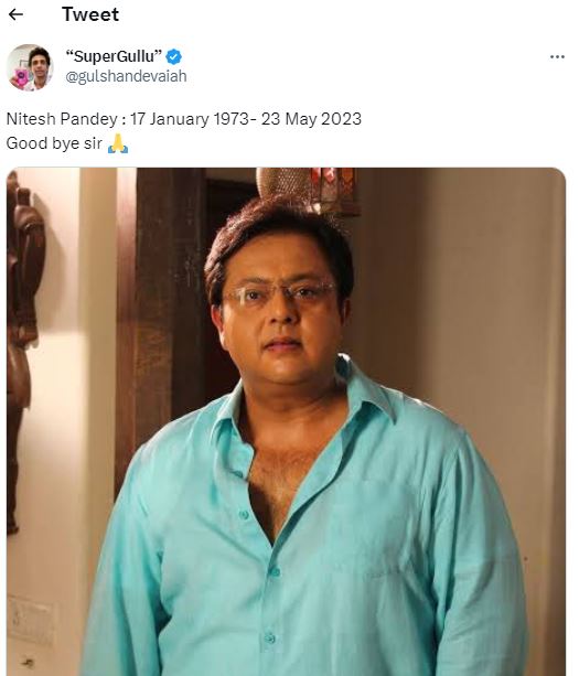 इसके अलावा 'दहाड़' एक्टर गुलशन देवैया ने ट्वीट करते हुए नितेश पांडे की तस्वीर शेयर की और उनकी जन्मतिथि से लेकर डेथ तक की डेट लिखते हुए अपना दुख व्यक्त किया। उन्होंने लिखा, "गुडबाय सर"।