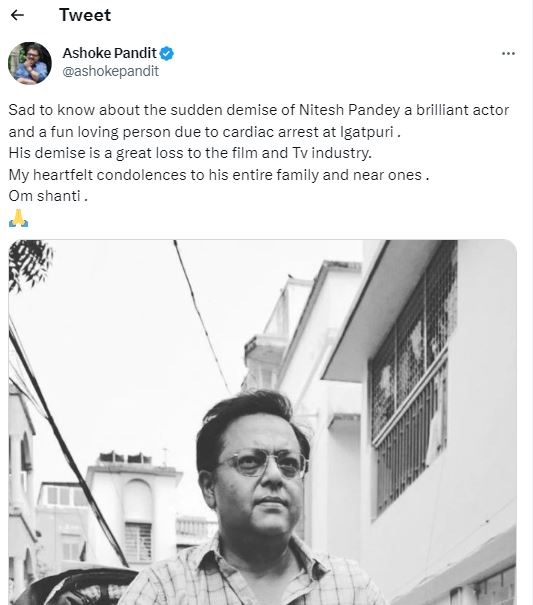 अशोक पंडित ने नितेश पांडे के निधन पर शोक व्यक्त करते हुए लिखा, "नितेश पांडे के अचानक निधन की खबर सुनकर दुख हुआ, वह बहुत ही शानदार एक्टर थे और फन लविंग पर्सन थे। उनका निधन इंडस्ट्री के लिए एक बड़ा नुकसान है। उनके परिवार और करीबियों को मेरी संवेदनाए"।