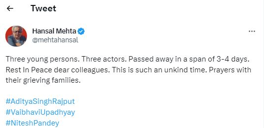 हंसल मेहता ने नितेश पांडे के साथ-साथ अन्य एक्टर्स के निधन पर अपना दुख व्यक्त करते हुए लिखा, "तीन यंग लोग, तीन एक्टर्स, जिन्होंने 3-4 दिनों के अंदर ही इस दुनिया को अलविदा कह दिया । भगवान आप सबकी आत्मा को शांति दे, ये सच में बहुत बुरा समय है। उनके परिवार के प्रति मेरी संवेदनाए"।