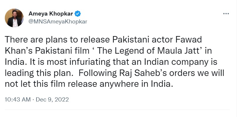 अमेय खोपकर ने ट्वीट करते हुए कहा, "पाकिस्तानी एक्टर फवाद खान की पाकिस्तानी फिल्म 'द लीजेंड ऑफ मौला जट्ट' को भारत में रिलीज करने की योजना है। सबसे ज्यादा गुस्सा दिलाने वाली बात यह है कि एक भारतीय कंपनी इस प्लान को आगे लेकर जा रही है। राज साहब के आदेश के बाद हम इस फिल्म को भारत में कहीं भी रिलीज नहीं होने देंगे।"