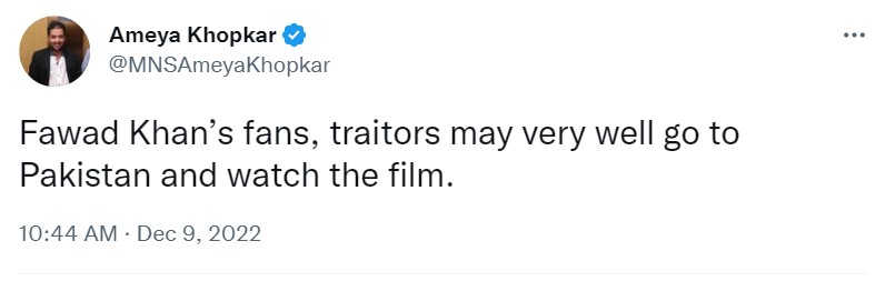 अमेय खोपकर ने एक अन्य ट्वीट में फवाद खान के फैंस को खरी-खोटी सुनात हुए उन्हें देशद्रोही बताया और फिल्म देखने के लिए पाकिस्तान जाने की बात कही। खोपकर ने लिखा, "फवाद खान के फैंस, देशद्रोही पाकिस्तान जाकर फिल्म देख सकते हैं।"